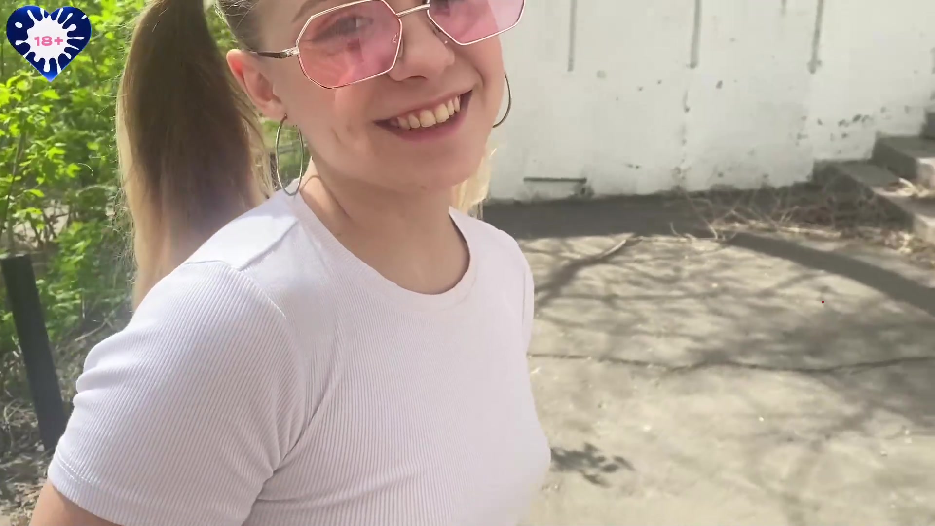 Sexy schoolgirl busts on porch. Cock sucking, doggy style. Horny slut.