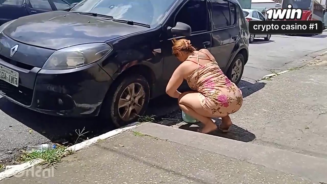 Uma mulher atraente lava o carro se exibindo na rua em cenas explícitas.